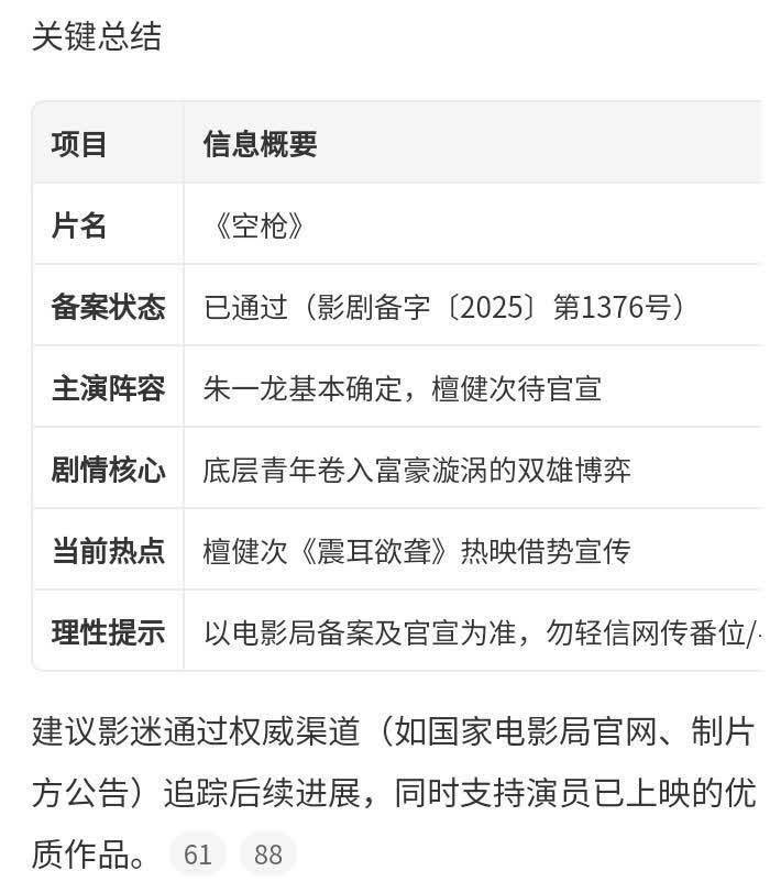 这,恰是《空枪》现在的处境。它不再是毫无左证的传言,国度电影局的备案明剖析白,片名、类型、出品方等信息准确无误,如同业将上膛的枪弹,冰冷且可信无疑。认真制作的猫眼影业,曾打造出《封神》的庞大面貌与《默杀》的凌厉格调,这么的班底,显着是冲着打造“王炸”作品去的。
