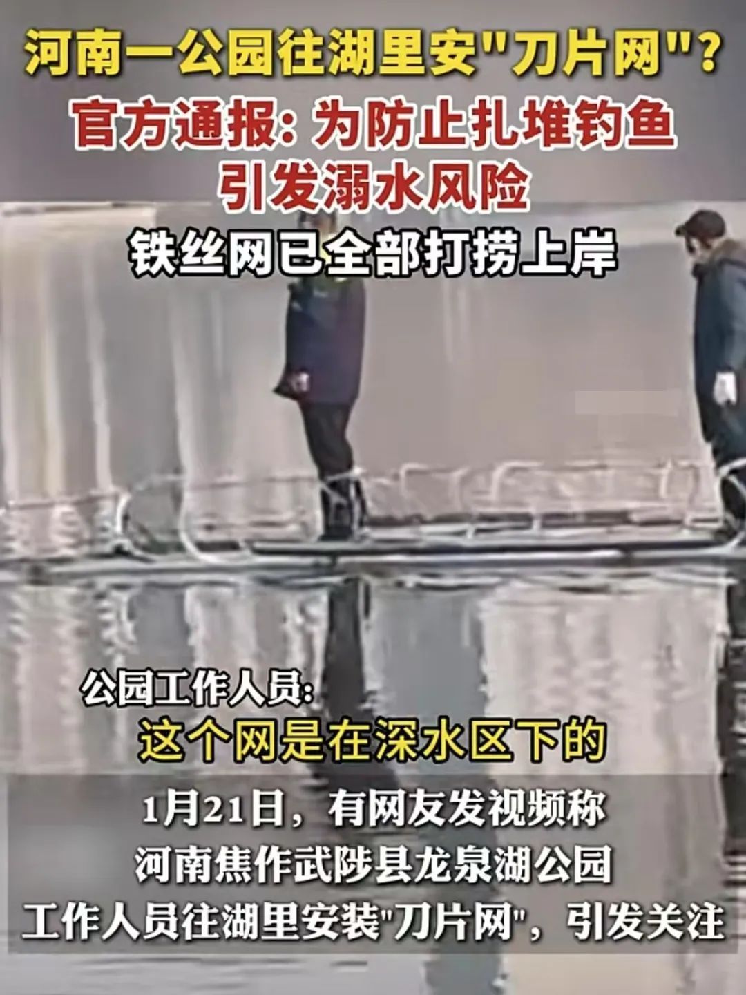 1月21日,有网友发视频称,河南焦作武陟县龙泉湖公园责任主说念主员往湖里下“刀片网”,激发讲理。网友发布的视频披露,岸边放有一大盘带着疑似“刀片”的铁丝网,有工东说念主正戴入辖下手套梳理铁网,该网友在岸边高宣称:“为了不让咱们舒服文娱,尽然往湖里下刀片。”