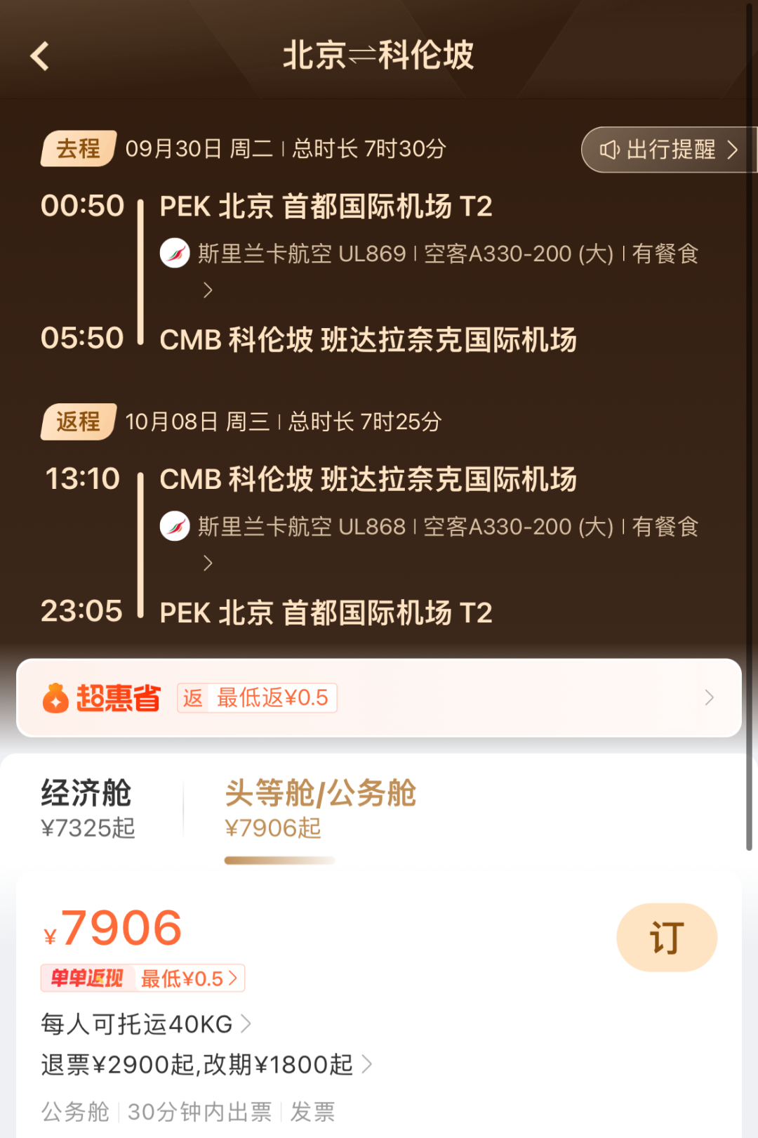 国庆经济/公事舱价钱基本一致,含税皆是7K+