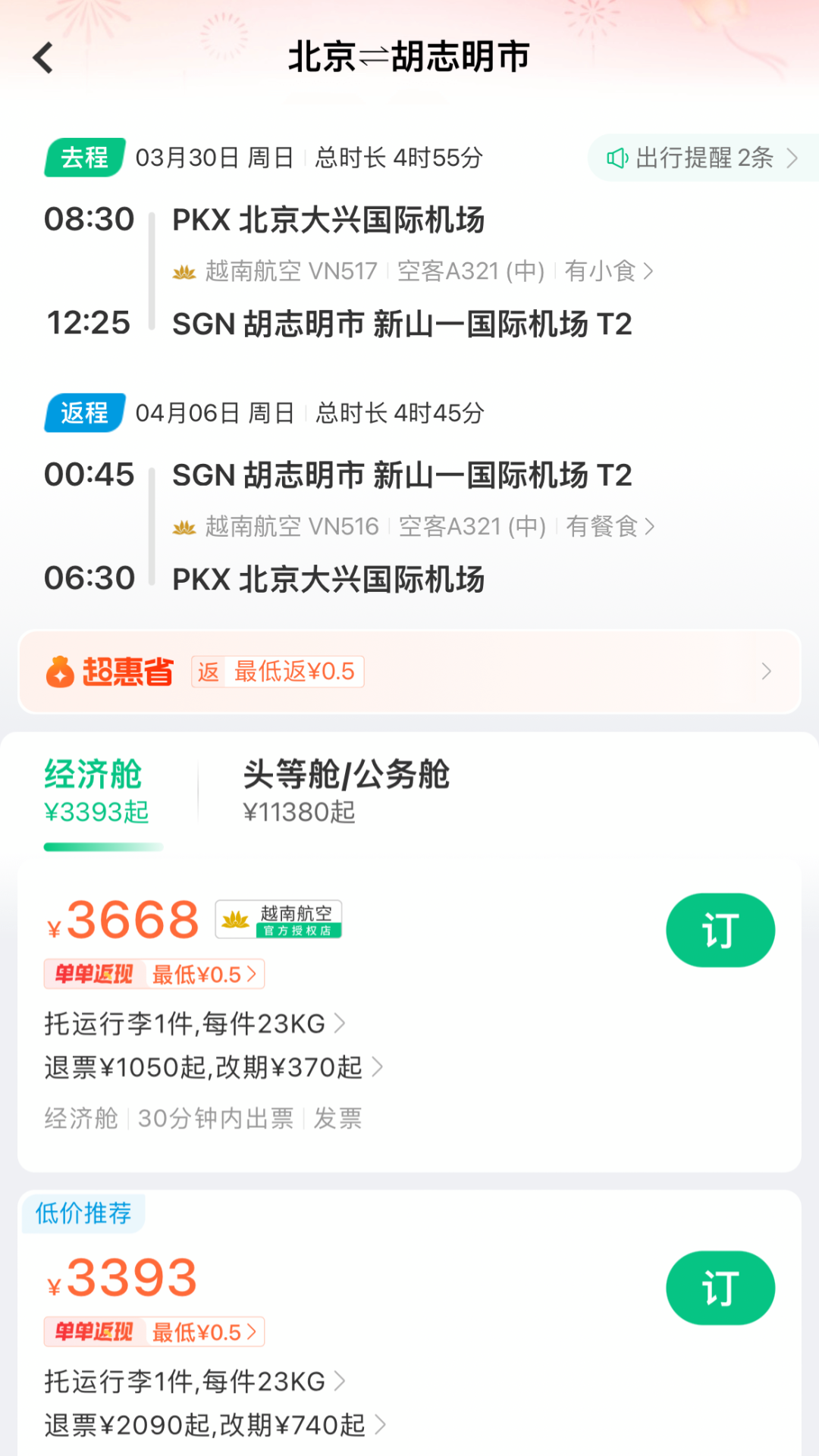 2、越南航空:北京=胡志明