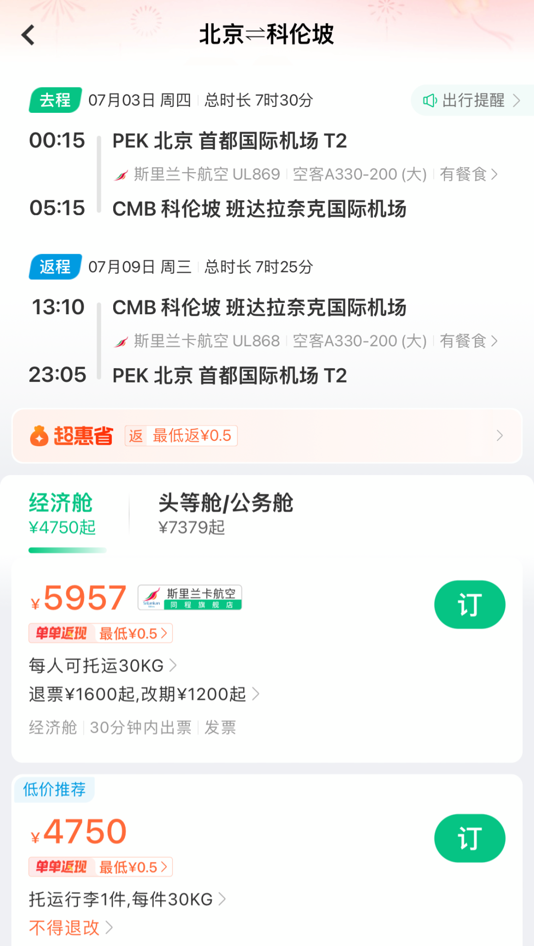3、斯里兰卡航空:北京=科伦坡
