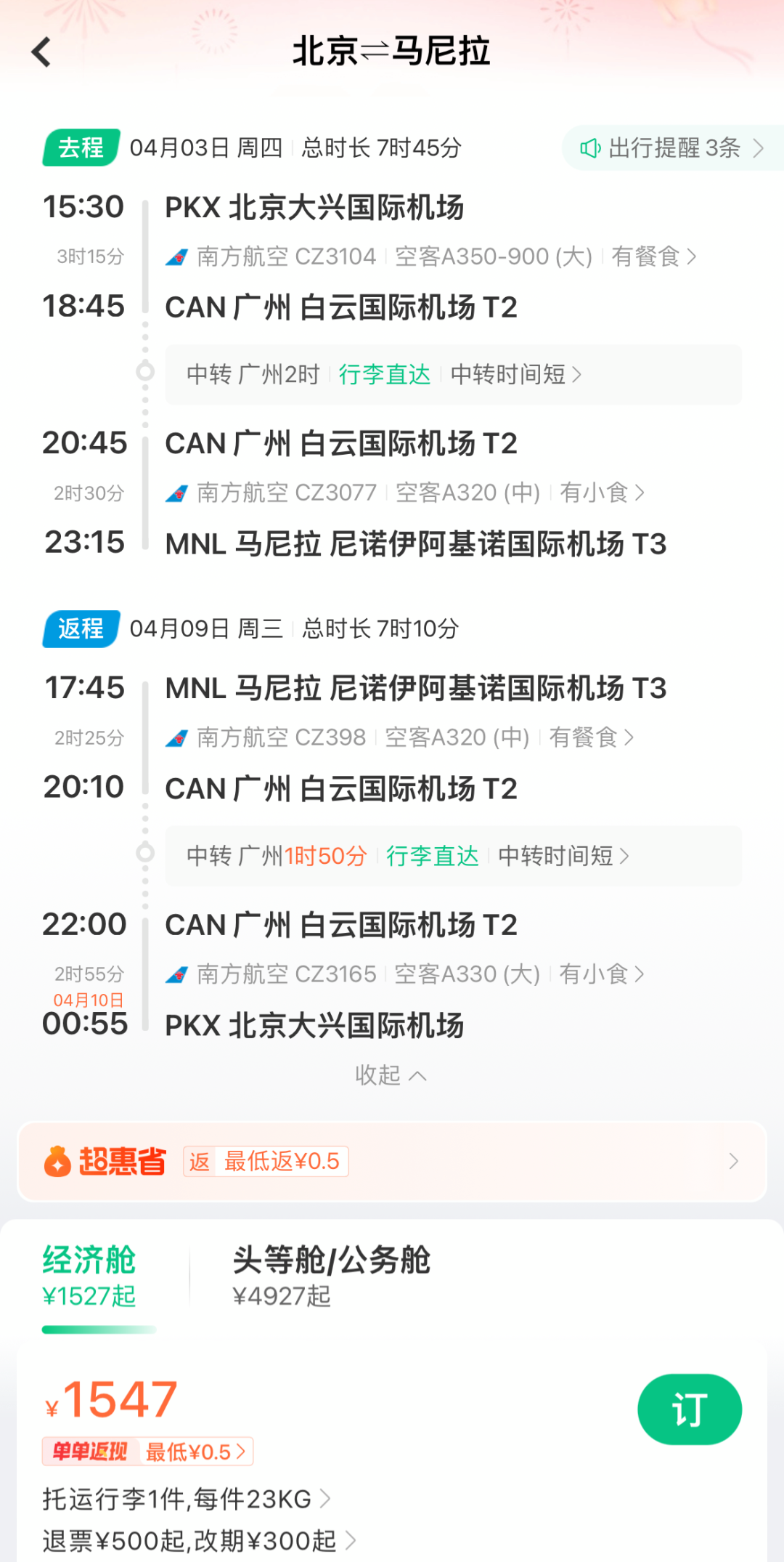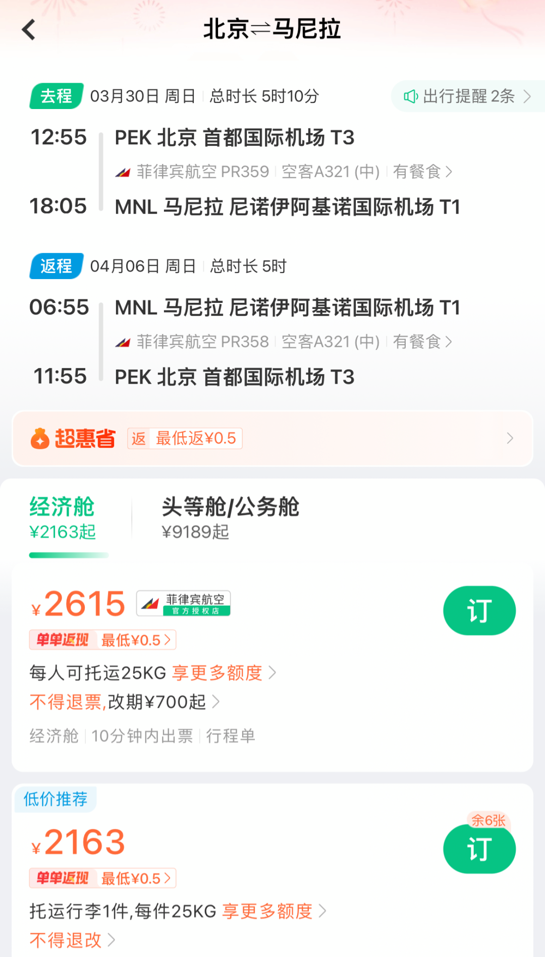 菲航将于3月30日复航,每周三班(2/5/7) ,由空客A321捏飞。当今直航含税2K1