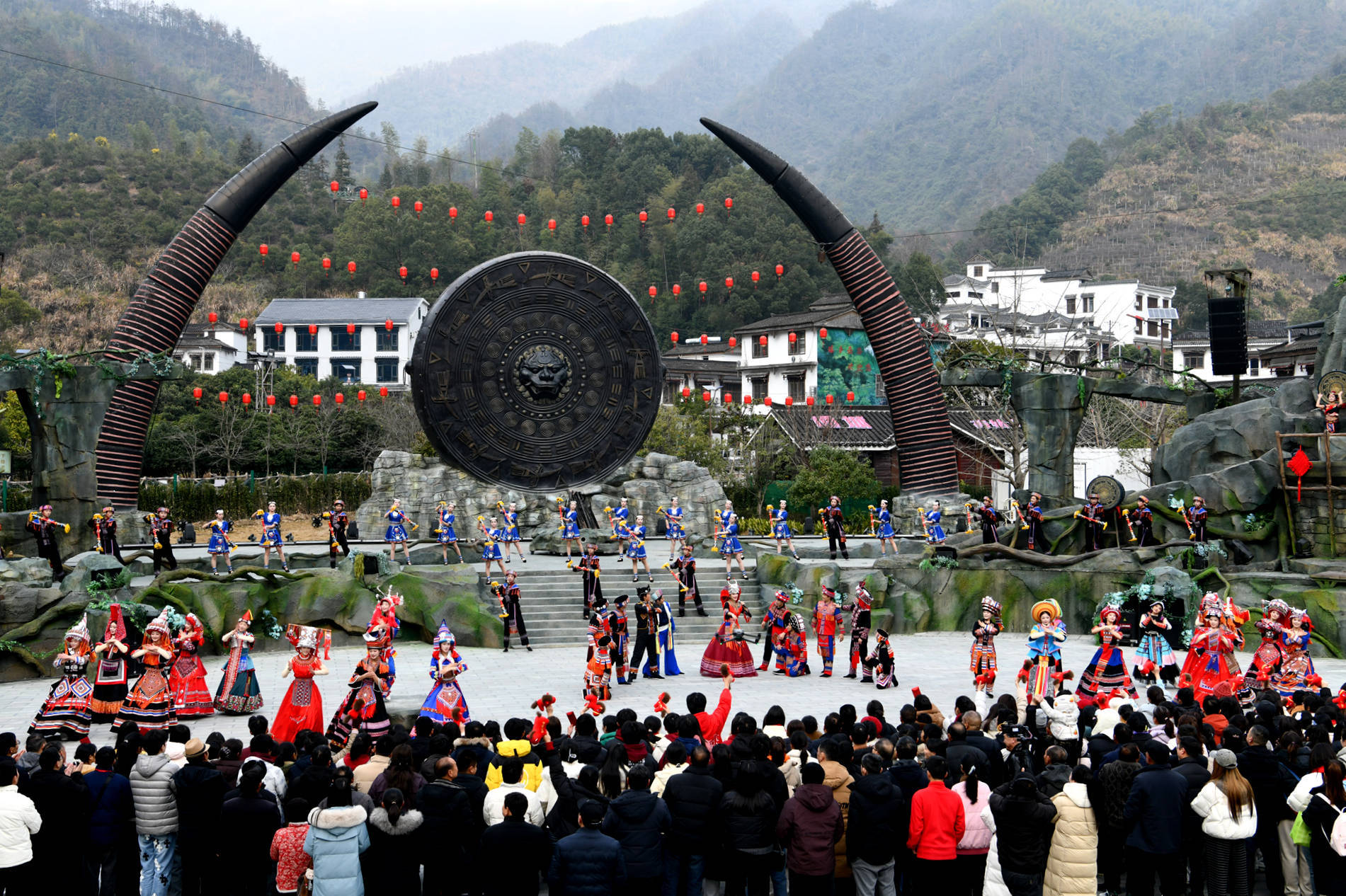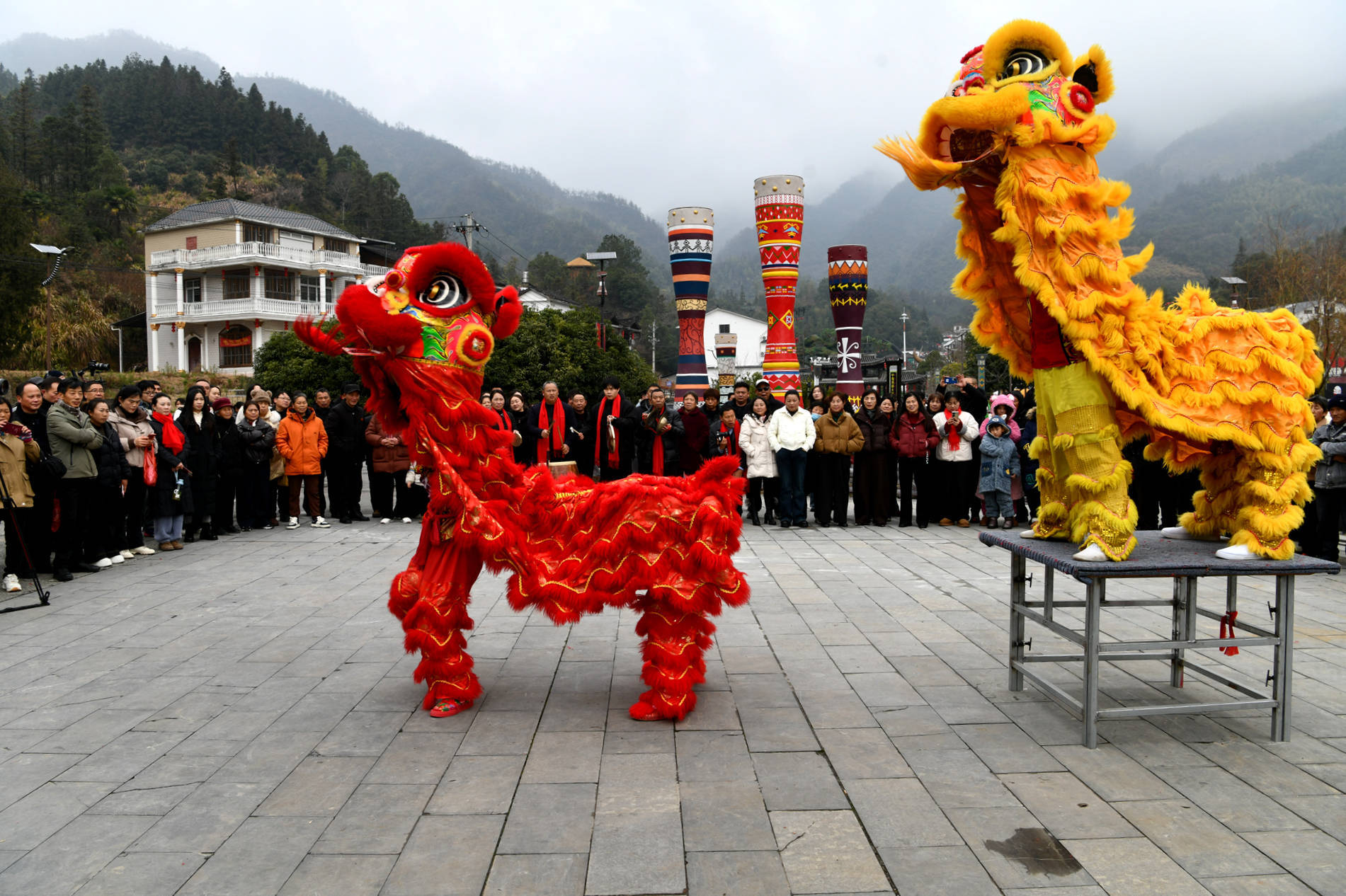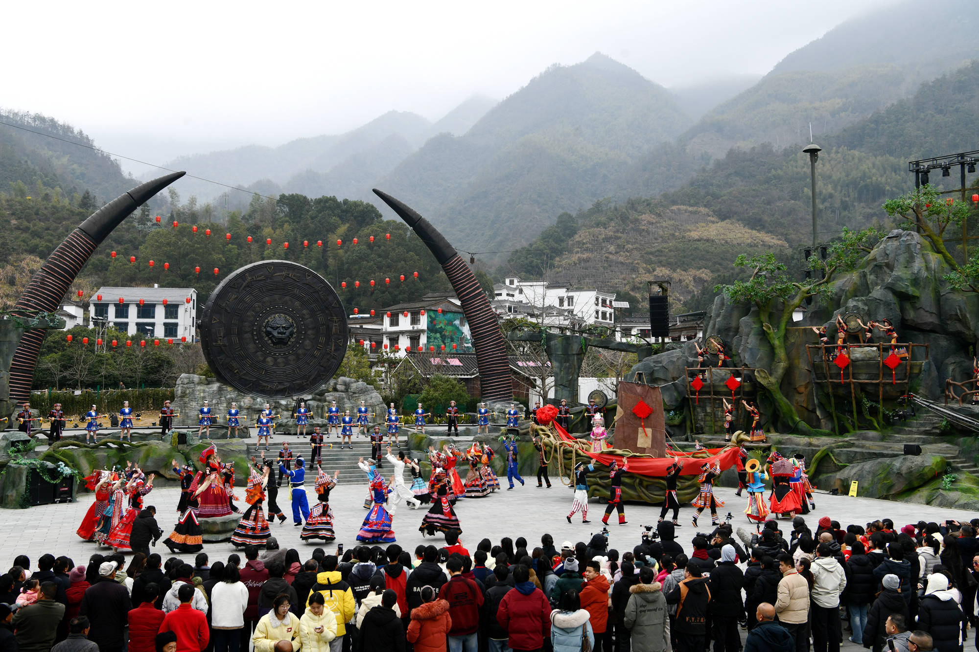 2026年1月27日,旅客在湖北省咸宁市通城县药姑山古瑶村景区不雅看舞狮扮演。