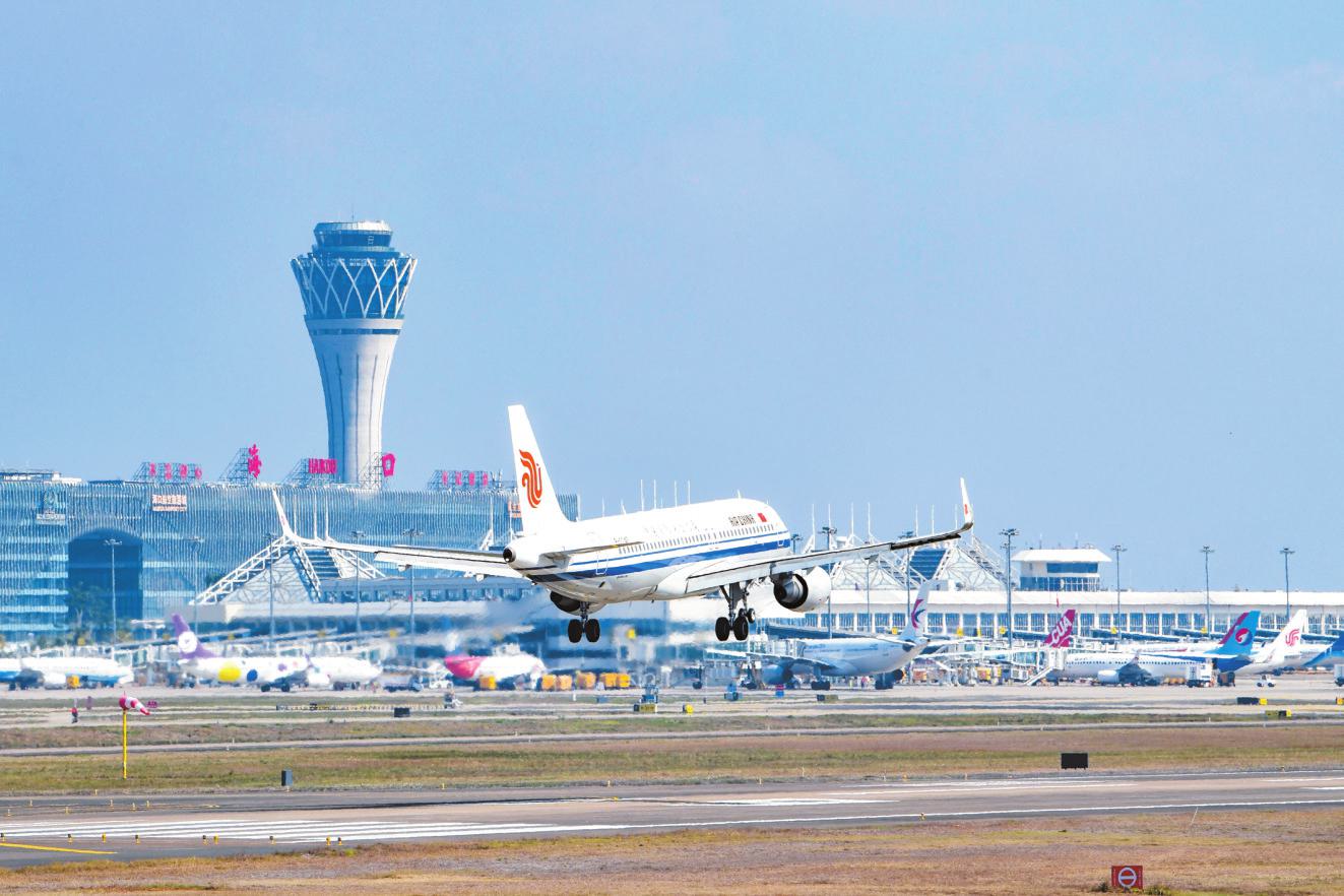 1月21日,一架客机从海口好意思兰海外机场降落。本报记者 苏弼坤 摄