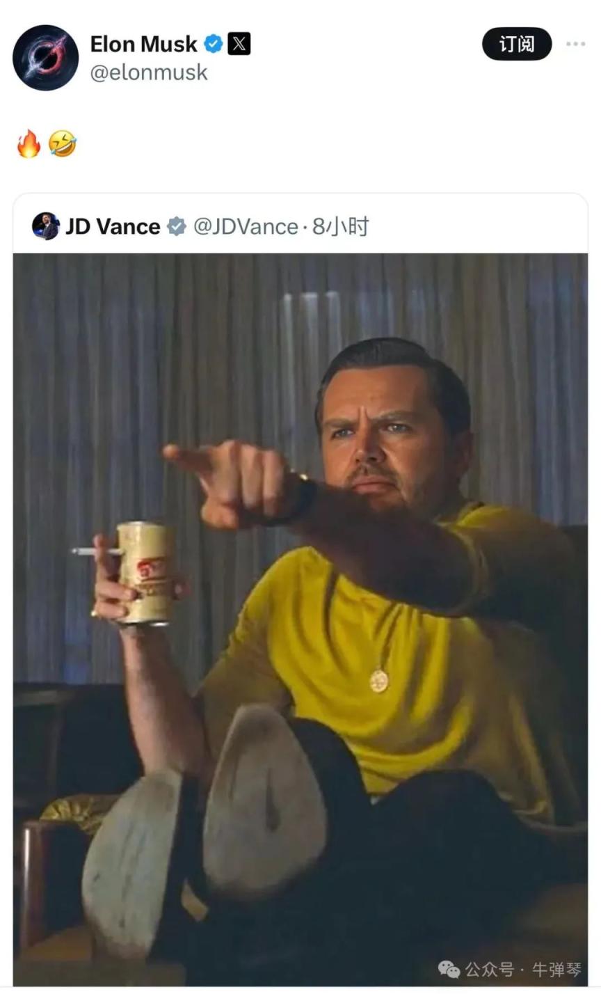 况且,马斯克还转发了一张副总统万斯的图片,万斯抽着烟,很适意地躺着,手指着前线。