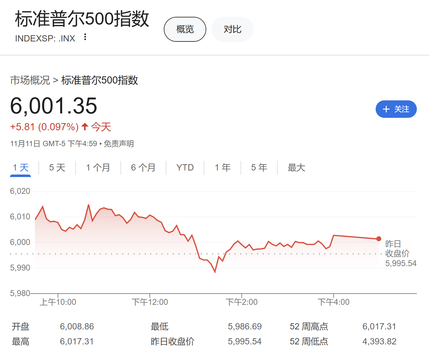 好意思股三大指数周一集体收涨,均续创历史新高,其中标普500指数初次站上6000点大关。放弃收盘,标普500指数涨5.81点,涨幅为0.10%,报6001.35点。昔日一周,受特朗普胜选乐不雅热情鼓励,好意思股创下了本年以来最佳的一周。