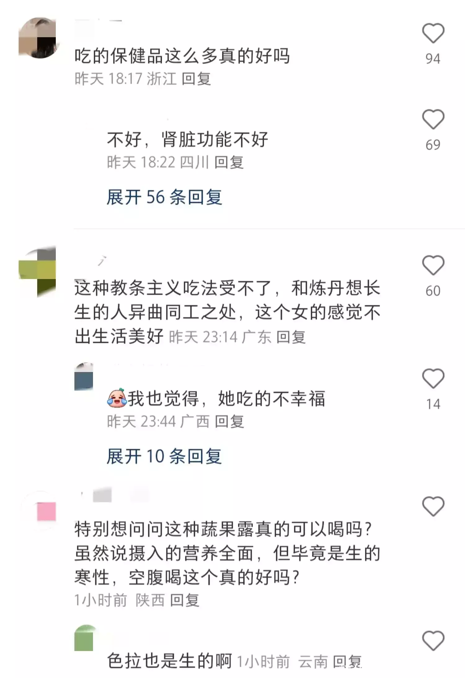 不少网友对她这样液断+保健品的一天,王人是佩服,同期又有质疑。高出是每天王人要吃这样保健品,不少网友提问“真的不会伤到肾脏吗?”。