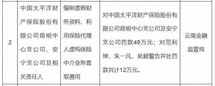 【大河财立方讯息】11月28日,云南金融监管局涌现的行政解决信息公示列表涌现,因编制诞妄财务贵寓、诈骗保障代理东说念主诬捏保障中介业务套取用度,中国太平洋财产保障股份有限公司昆明中心支公司及从容支公司被罚49万元。