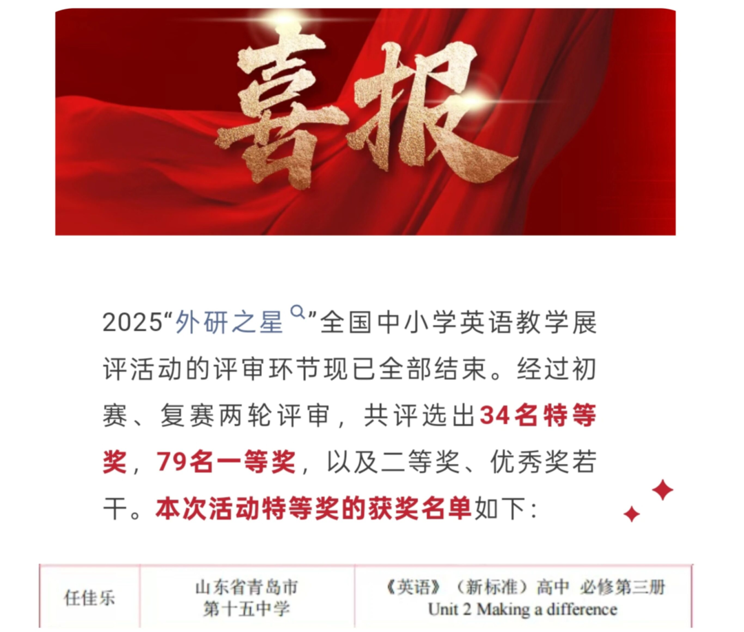 日前,2025“外研之星”寰宇中小学英语训导展评步履成果揭晓,青岛实验高中高二英语西宾任佳乐凭借塌实的课堂策划与亮眼的训导发达,斩获青岛市唯独一个颠倒奖。